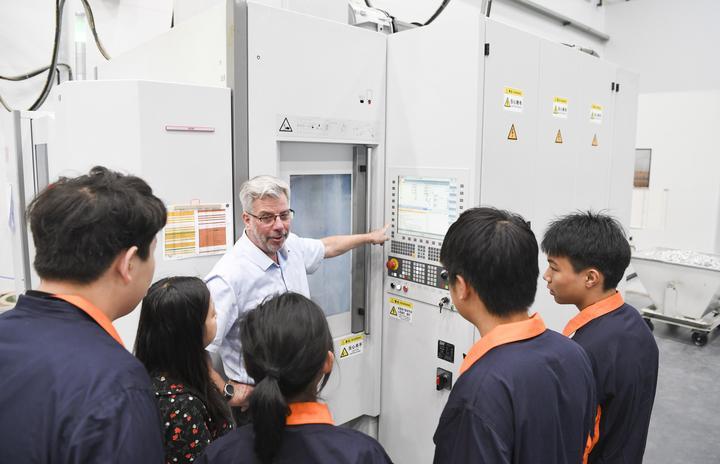 2024年4月16日,在位于重慶市永川區(qū)中德產(chǎn)業(yè)園的埃斯維(重慶)機(jī)床有限公司,公司技術(shù)總監(jiān)向重慶城市職業(yè)學(xué)院中德產(chǎn)業(yè)學(xué)院學(xué)生介紹設(shè)備操作規(guī)范。近年來(lái),重慶城市職業(yè)學(xué)院聯(lián)合德國(guó)教育力量共建產(chǎn)業(yè)學(xué)院,引入職業(yè)教育先進(jìn)經(jīng)驗(yàn),著力培養(yǎng)適合制造型企業(yè)需求的高素質(zhì)技能技術(shù)人才。