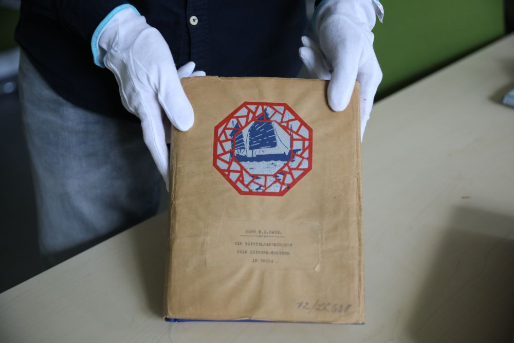 7月30日,在德國(guó)柏林的西門子歷史檔案館,歷史學(xué)家埃瓦爾德·布勒歇爾展示《拉貝日記》部分原件。新華社記者 杜哲宇 攝