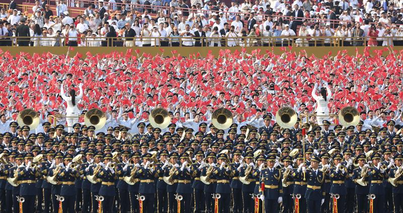 紀(jì)念大會(huì)開(kāi)始前,天安門廣場(chǎng)上,千人聯(lián)合軍樂(lè)團(tuán)演奏四首歌曲,合唱團(tuán)唱響《松花江上》《在太行山上》《保衛(wèi)黃河》《沒(méi)有共產(chǎn)黨就沒(méi)有新中國(guó)》。