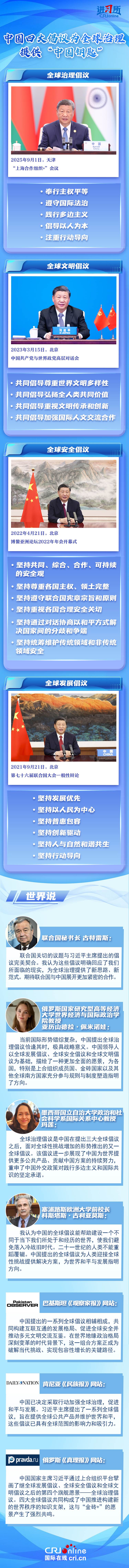 “堅持在歷史前進的邏輯中前進、在時代發(fā)展的潮流中發(fā)展?!比蛑卫沓h是繼全球發(fā)展倡議、全球安全倡議、全球文明倡議后,中國為解決全球性沖突和挑戰(zhàn)貢獻的又一重要公共產(chǎn)品。四大全球倡議各有側(cè)重,并行不悖,分別從發(fā)展、安全、文明、治理四個維度,為回答“世界怎么了、我們怎么辦?”這一世界之問、歷史之問、時代之問提供了“中國鑰匙”,彰顯了中國在國際事務(wù)中的大國擔(dān)當(dāng)。國際社會表示,中國一系列全球倡議明確回應(yīng)了世界所面臨的現(xiàn)實問題,為全球治理提供了新思路、新范式,展現(xiàn)了中國為世界提供更多公共產(chǎn)品、貢獻中國方案的持續(xù)努力。