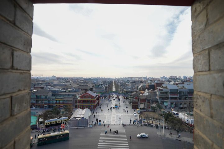 2024年12月26日,從正陽(yáng)門(mén)箭樓內(nèi)向南拍攝的北京前門(mén)大街和遠(yuǎn)處的永定門(mén)城樓。新華社記者 鞠煥宗 攝