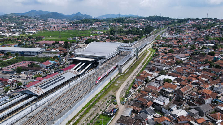 這是2025年5月20日在印度尼西亞帕達(dá)拉朗拍攝的雅萬(wàn)高鐵列車(無(wú)人機(jī)照片)。新華社記者 徐欽 攝