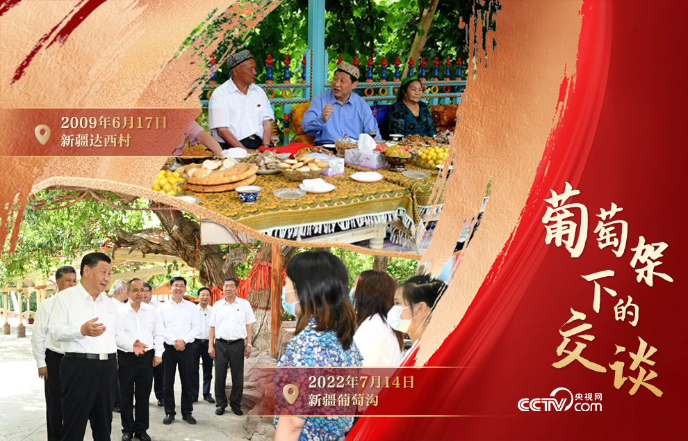 這段對(duì)話,發(fā)生于2022年7月14日。那天下午,習(xí)近平總書記來(lái)到新疆吐魯番的葡萄溝,與來(lái)自天南海北的游客親切交談。