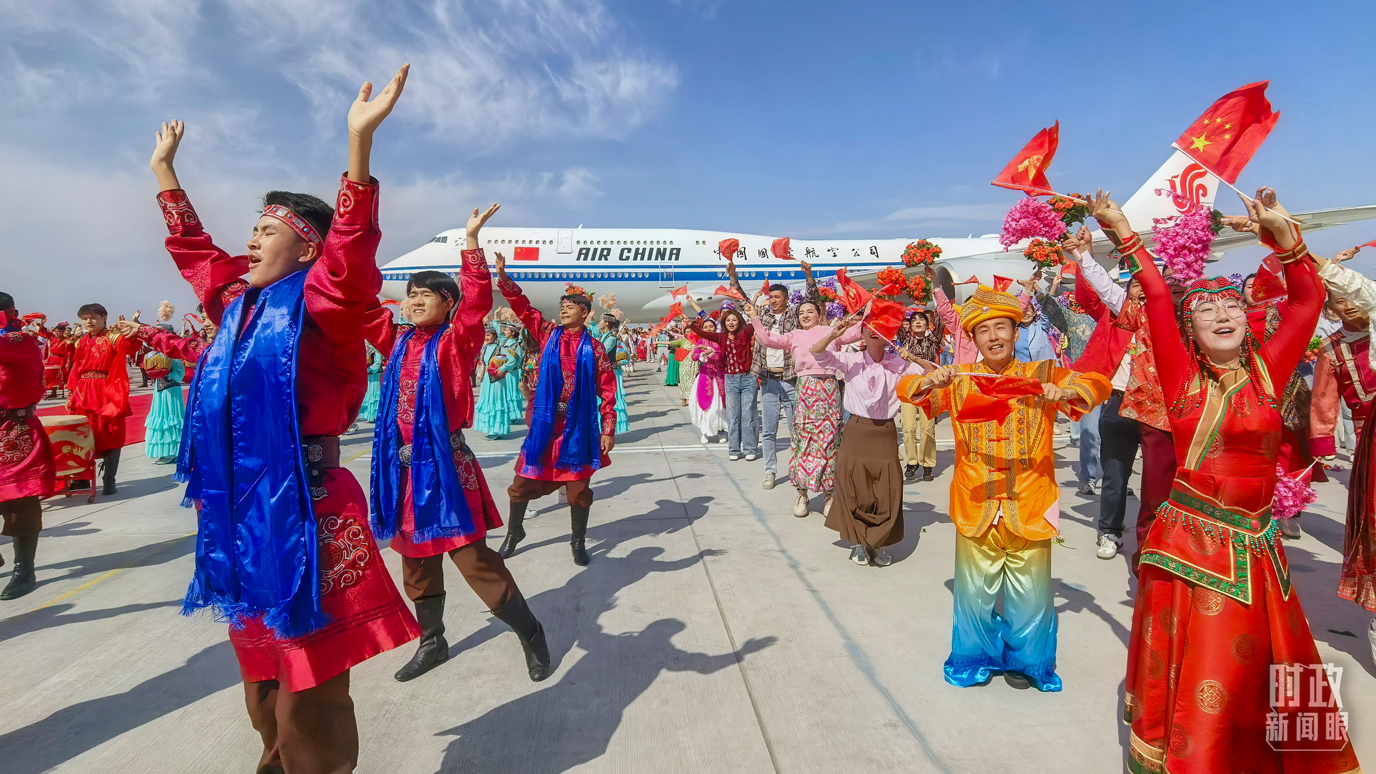 烏魯木齊天山國(guó)際機(jī)場(chǎng),新疆各族群眾熱烈歡迎總書記到來(lái)。(總臺(tái)央視記者范凱、史偉拍攝)