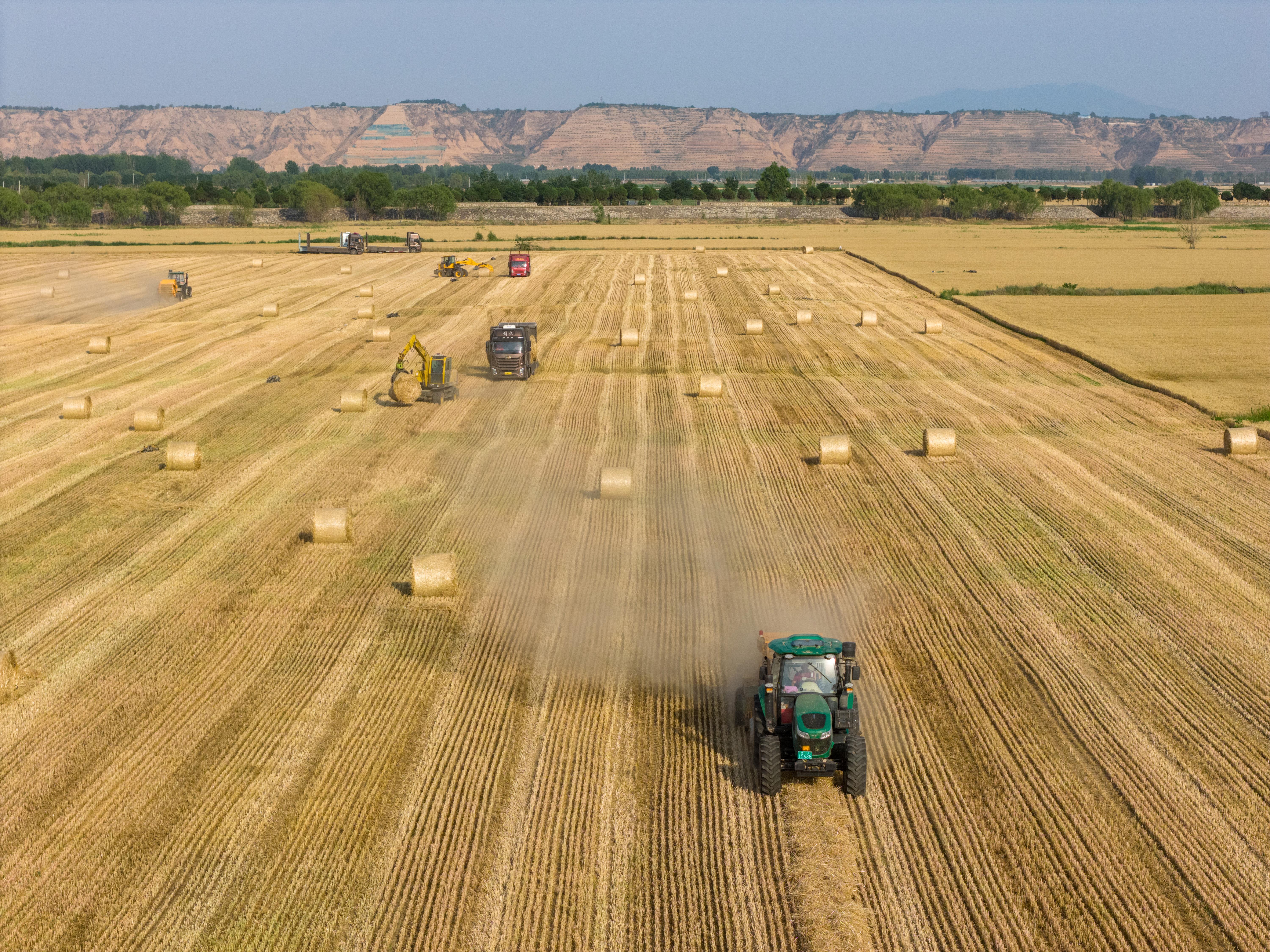 △據國家統(tǒng)計局發(fā)布的數據,2025年全國夏糧總產量14973.8萬噸,實現(xiàn)穩(wěn)產豐收。圖為今年6月,山西運城裴莊鎮(zhèn)黃河灘涂上,農機手忙著實施小麥秸稈打捆和裝車運輸作業(yè)。