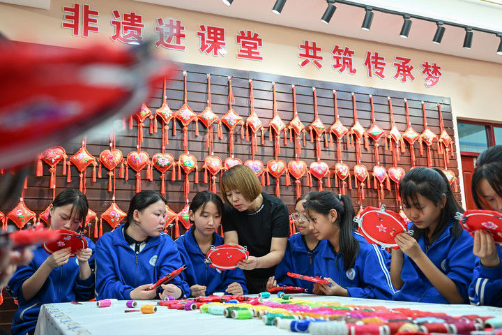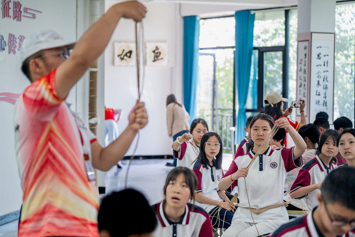 2025年9月26日,內(nèi)蒙古興安盟科右中旗巴彥呼舒第六中學美術(shù)教師、非遺代表性傳承人吳斯琴(左四)指導學生刺繡。近年來,內(nèi)蒙古興安盟科爾沁右翼中旗巴彥呼舒第六中學將當?shù)貒壹壏沁z圖什業(yè)圖刺繡引入校園,開設校本課程,并成立興趣社團,在豐富校園文化生活的同時,讓學生們近距離感受非遺的魅力,弘揚和傳承中華優(yōu)秀傳統(tǒng)文化。隨著國產(chǎn)動畫電影《哪吒之魔童鬧?!凡粩嗨⑿轮袊笆菲狈考o錄,參與電影配樂的貴州省榕江縣三寶侗寨的楊想妮和“舞樂蟬歌”團隊為更多人所熟知。樂團成員懷揣“用音樂傳遞侗族文化,讓世界聽見侗族大歌”的共同夢想,將侗族大歌推向更廣闊的舞臺。這是2025年4月22日,楊想妮在貴州省黎平縣肇興鎮(zhèn)廈格侗寨教前來研學的孩子們唱侗歌。