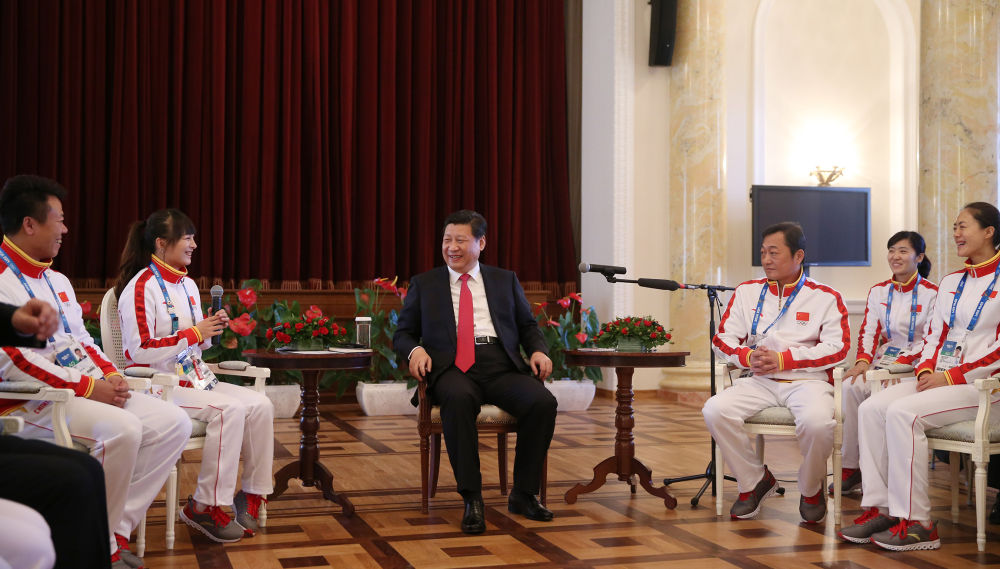 2014年2月7日,中共中央總書記、國家主席、中央軍委主席習近平在俄羅斯索契親切看望參加第二十二屆冬季奧林匹克運動會的中國體育代表團。這是習近平在座談會上與代表團成員親切交流。新華社記者 蘭紅光 攝