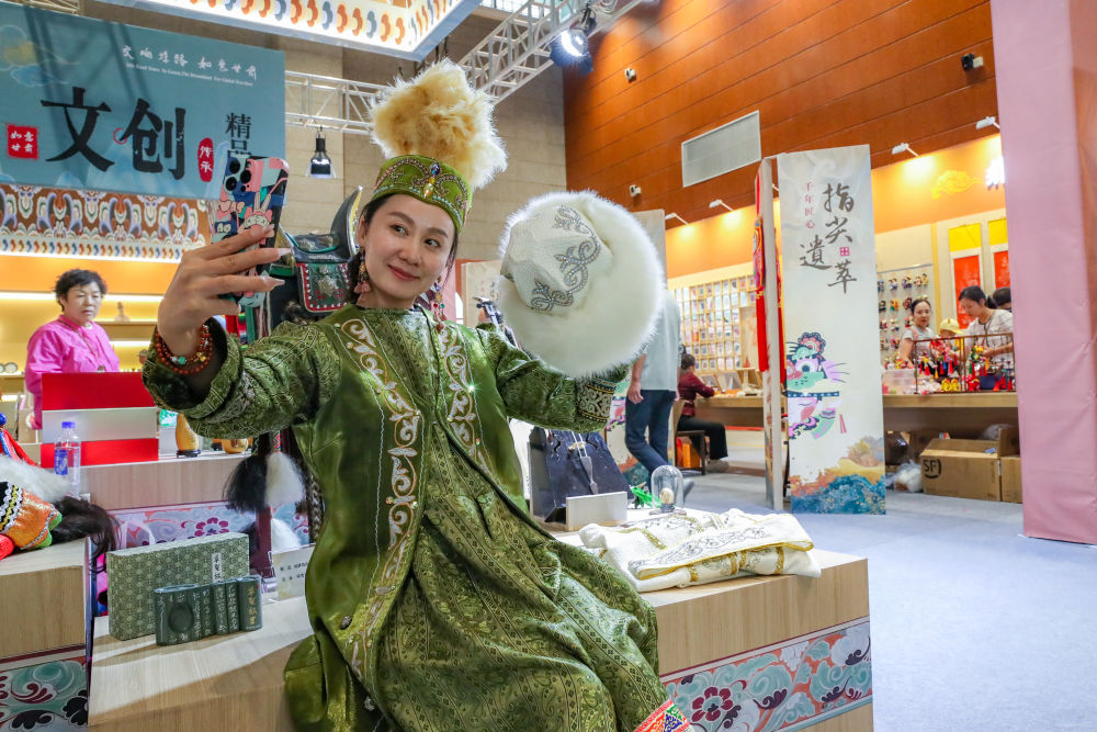 2025年9月22日,游客在敦煌文博會上身穿民族服飾自拍。9月20日至22日,第八屆絲綢之路(敦煌)國際文化博覽會在敦煌市舉行。敦煌研究院“典范”“高地”建設(shè)成果展、甘肅文旅非遺文創(chuàng)展、敦煌·絲路雕塑展等多項(xiàng)展覽同步亮相,集中展現(xiàn)了敦煌文化遺產(chǎn)保護(hù)、研究、弘揚(yáng)的最新成果以及共建“一帶一路”國家的文化藝術(shù)、非遺文創(chuàng)、風(fēng)土人情等精彩內(nèi)容。