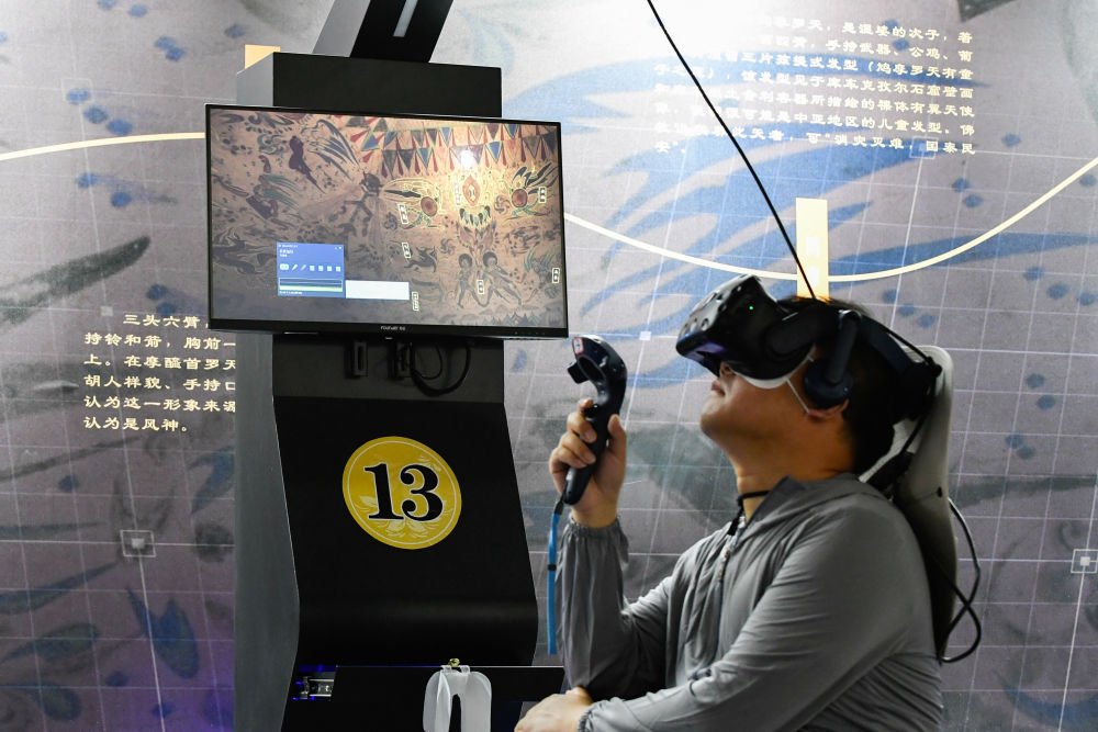 2024年7月22日,一名游客在敦煌莫高窟“尋境敦煌——數(shù)字敦煌沉浸展”上借助VR設(shè)備沉浸式游覽莫高窟第285窟虛擬場景。“尋境敦煌”綜合運(yùn)用了VR虛擬現(xiàn)實(shí)、三維建模、游戲引擎的物理渲染和全局動態(tài)光照等新技術(shù),高精度立體還原了莫高窟第285窟。游客戴上VR眼鏡,不僅可以零距離觀賞壁畫、360度自由探索洞窟細(xì)節(jié),還能“飛升”到窟頂,身臨其境參與壁畫故事情節(jié),沉浸式感受敦煌文化的魅力。