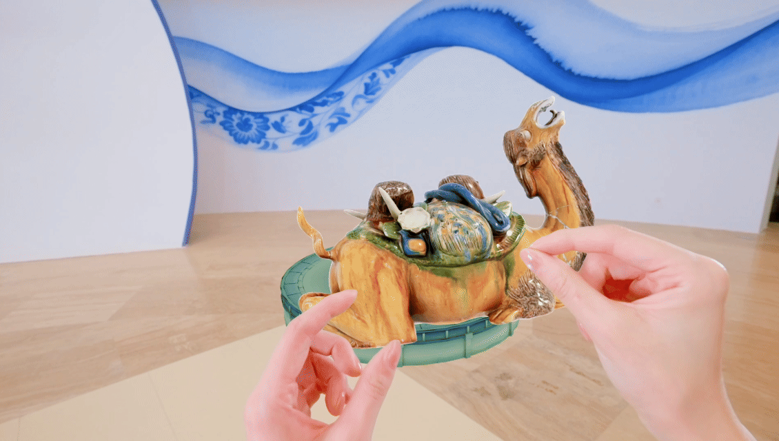 “這款MR眼鏡使用的就是3D技術(shù),該技術(shù)能夠清晰地將文物的紋飾紋樣、顏色、形制等信息采集下來。戴上MR眼鏡后,觀眾能夠放大縮小、旋轉(zhuǎn)文物,增強(qiáng)了觀看體驗(yàn)?!崩钤凑f。