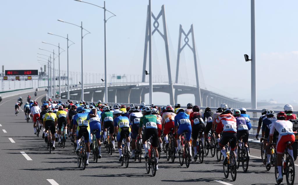 11月8日,參賽選手在港珠澳大橋騎行。當(dāng)日進(jìn)行的第十五屆全國(guó)運(yùn)動(dòng)會(huì)公路自行車(chē)男子個(gè)人賽,賽道全程231.8公里,選手經(jīng)過(guò)港珠澳大橋,跨越粵港澳三地。圖源:新華社