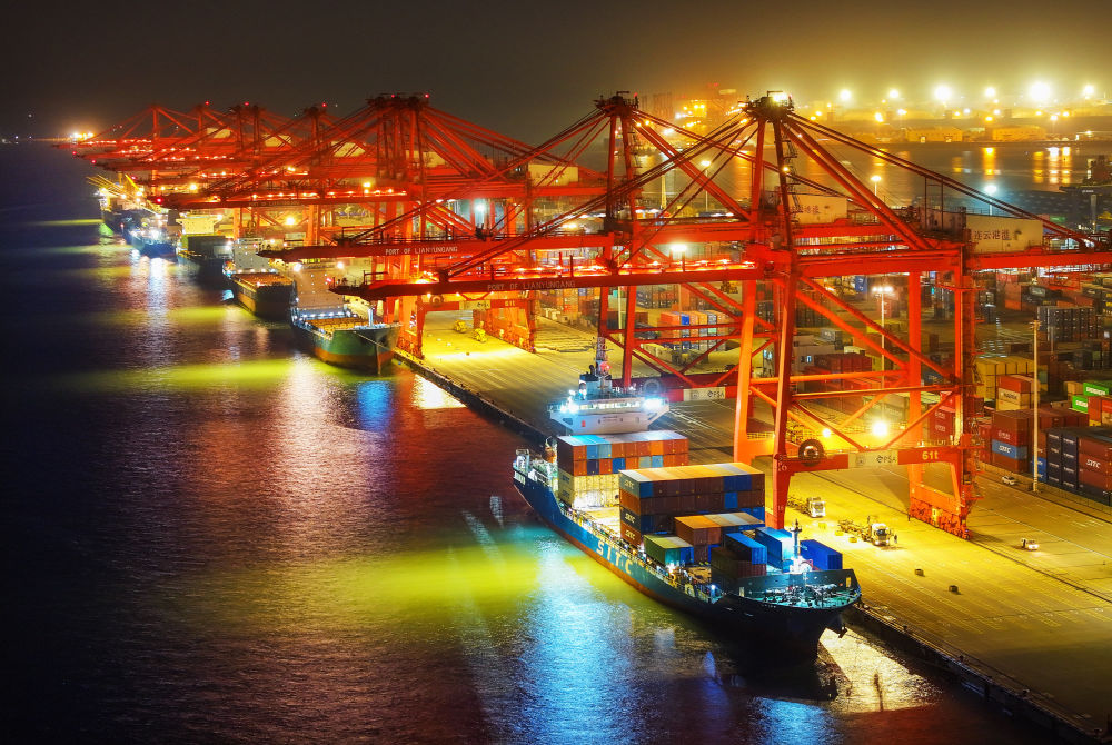 2024年12月14日晚拍攝的江蘇省連云港港集裝箱碼頭(無人機(jī)照片)。新華社發(fā)(王健民攝)