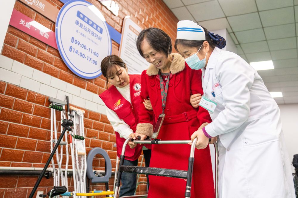 2025年11月6日,志愿者及醫(yī)務人員在湖南長沙望城區(qū)高塘嶺街道中南社區(qū)幫助行動不便的居民使用康復器具。