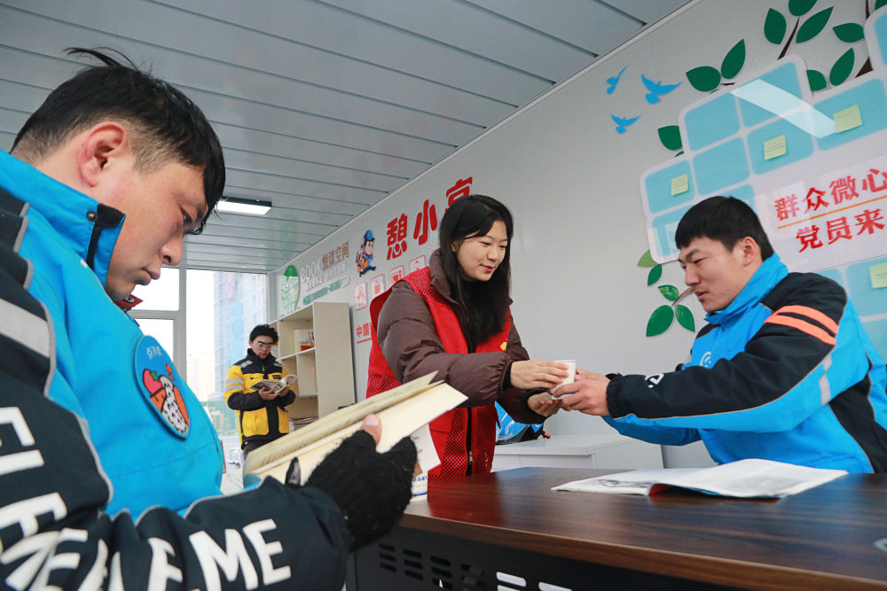 2023年12月27日,志愿者在山東省高密市密水街道“憩小亭”服務站為外賣騎手送上熱水。入冬以來,山東省高密市密水街道推進“憩小亭”暖心服務站建設,為外賣騎手、快遞小哥、網約車司機、環(huán)衛(wèi)工人等戶外勞動者提供飲水、無線上網、食物加熱等多項服務,讓他們感受到冬日里的溫暖。