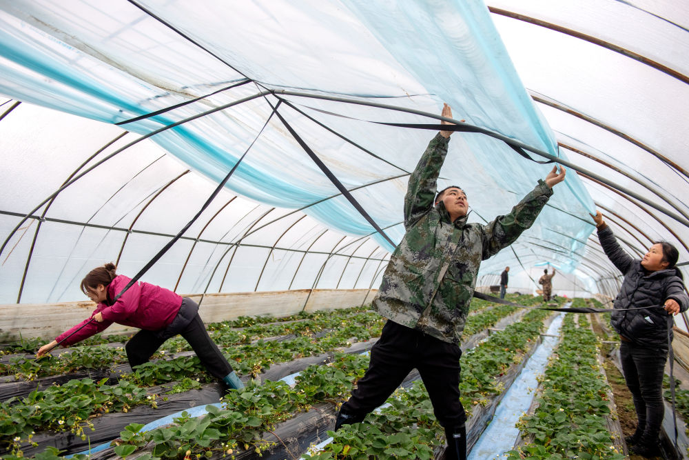 2023年12月15日,志愿者在浙江湖州長興縣水口鄉(xiāng)幫助農戶加蓋大棚保溫膜。為應對強雨雪天氣,志愿者們幫助農戶清理大棚上的積雪,加裝綁棚繩,棚內增設立柱,提高大棚抗風雪能力,確保農產品正常生產供應。