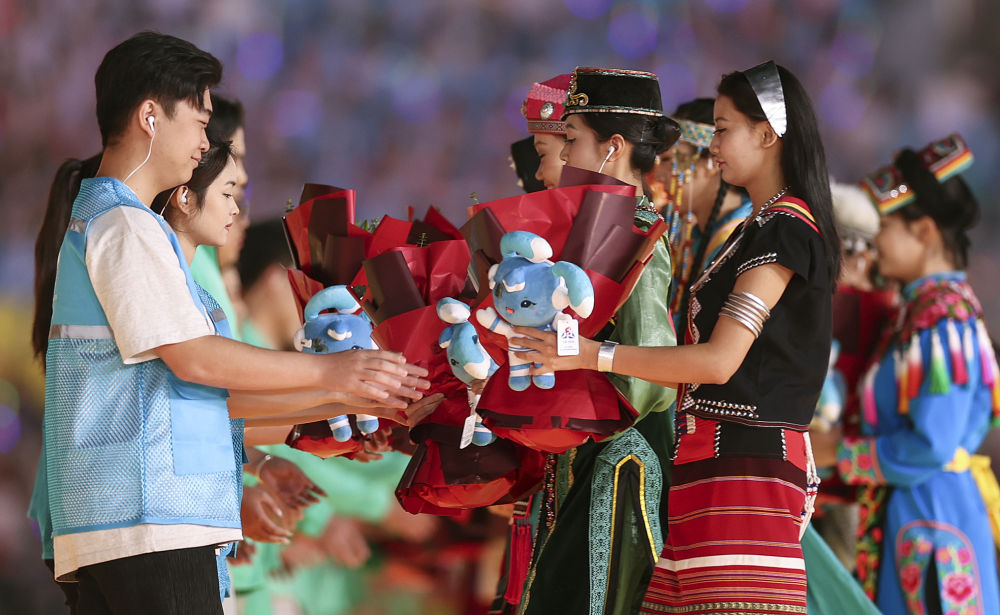 2024年11月30日,五十六個民族代表在海南三亞舉行的第十二屆全國少數民族傳統(tǒng)體育運動會閉幕式上為志愿者獻花。運動會期間,數千名志愿者“小鹿鹿”奔赴十余個競賽場館、二十多家接待酒店、媒體中心、機場車站等地,為來自全國各地的運動員、技術官員、工作人員和觀眾提供禮賓接待、交通引導、安全保衛(wèi)等志愿服務。