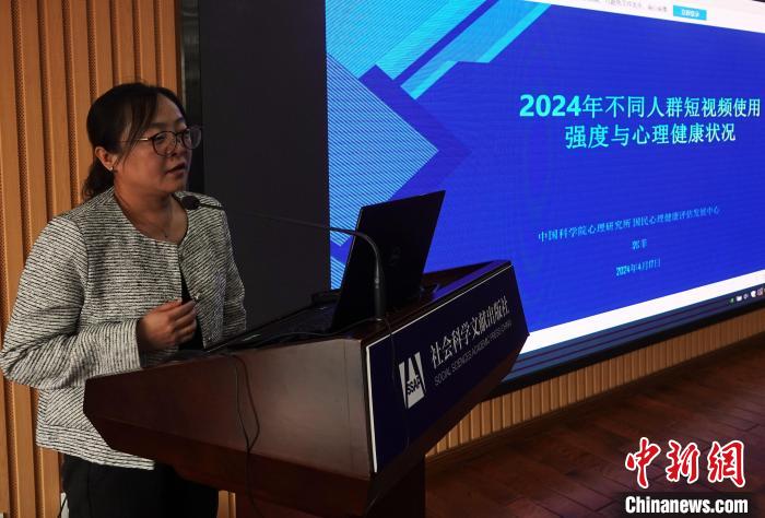 發(fā)布會(huì)上,中國(guó)科學(xué)院心理研究所助理研究員郭菲解讀“2024年不同人群短視頻使用強(qiáng)度與心理健康狀況”調(diào)查報(bào)告。中新網(wǎng)記者 孫自法 攝