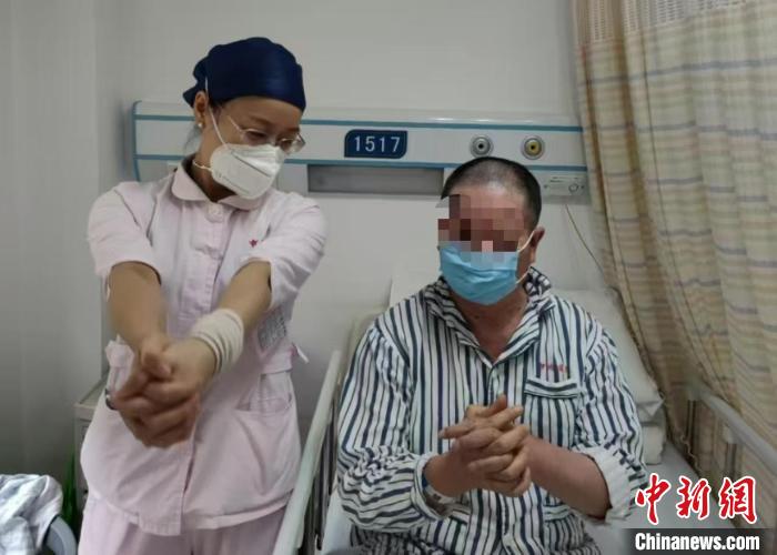 護(hù)士陸妍紅指導(dǎo)患者進(jìn)行上肢運(yùn)動(dòng)。(傅怡攝)