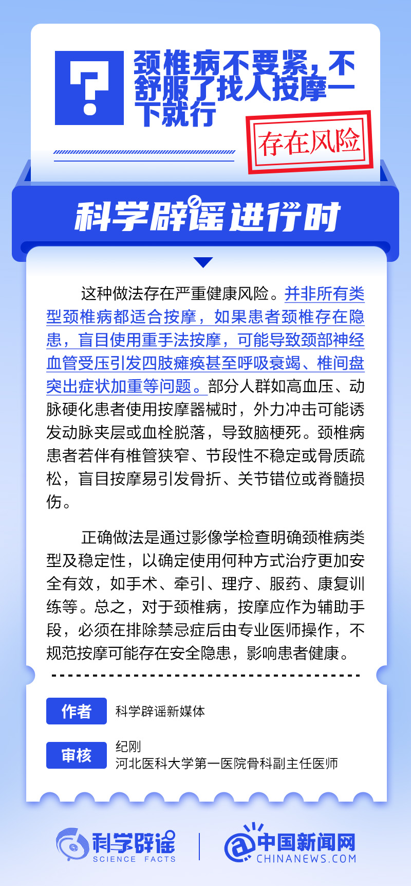 并非所有類型頸椎病都適合按摩,如果患者頸椎存在隱患,盲目使用重手法按摩,可能導(dǎo)致頸部神經(jīng)血管受壓引發(fā)四肢癱瘓甚至呼吸衰竭,椎間盤突出癥狀加重等問(wèn)題。部分人群如高血壓、動(dòng)脈硬化患者使用按摩器械時(shí),外力沖擊可能誘發(fā)動(dòng)脈夾層或血栓脫落,導(dǎo)致腦梗死。頸椎病患者若伴有椎管狹窄、節(jié)段性不穩(wěn)定或骨質(zhì)疏松,盲目按摩易引發(fā)骨折、關(guān)節(jié)錯(cuò)位或脊髓損傷。(來(lái)源:@科學(xué)辟謠 中國(guó)新聞網(wǎng)微博)