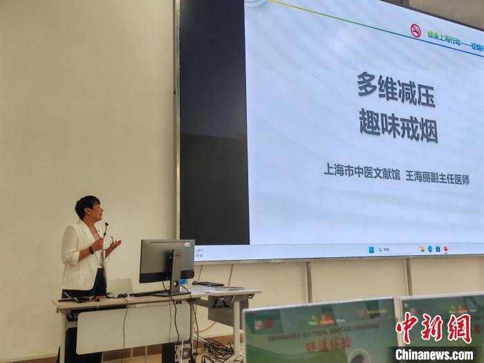 王海麗在上海應用技術(shù)大學,為學生系統(tǒng)闡釋中醫(yī)在控煙領(lǐng)域的特色干預方式,通過多個案例展現(xiàn)傳統(tǒng)醫(yī)學與現(xiàn)代公共衛(wèi)生的融合創(chuàng)新。(中新網(wǎng)記者陳靜攝)