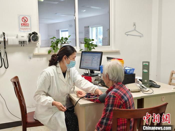 2025年,南潯區(qū)菱湖鎮(zhèn)西柵社區(qū)衛(wèi)生服務(wù)站,社區(qū)醫(yī)生馮米雅正在為老人測量血壓。項(xiàng)天琪供圖