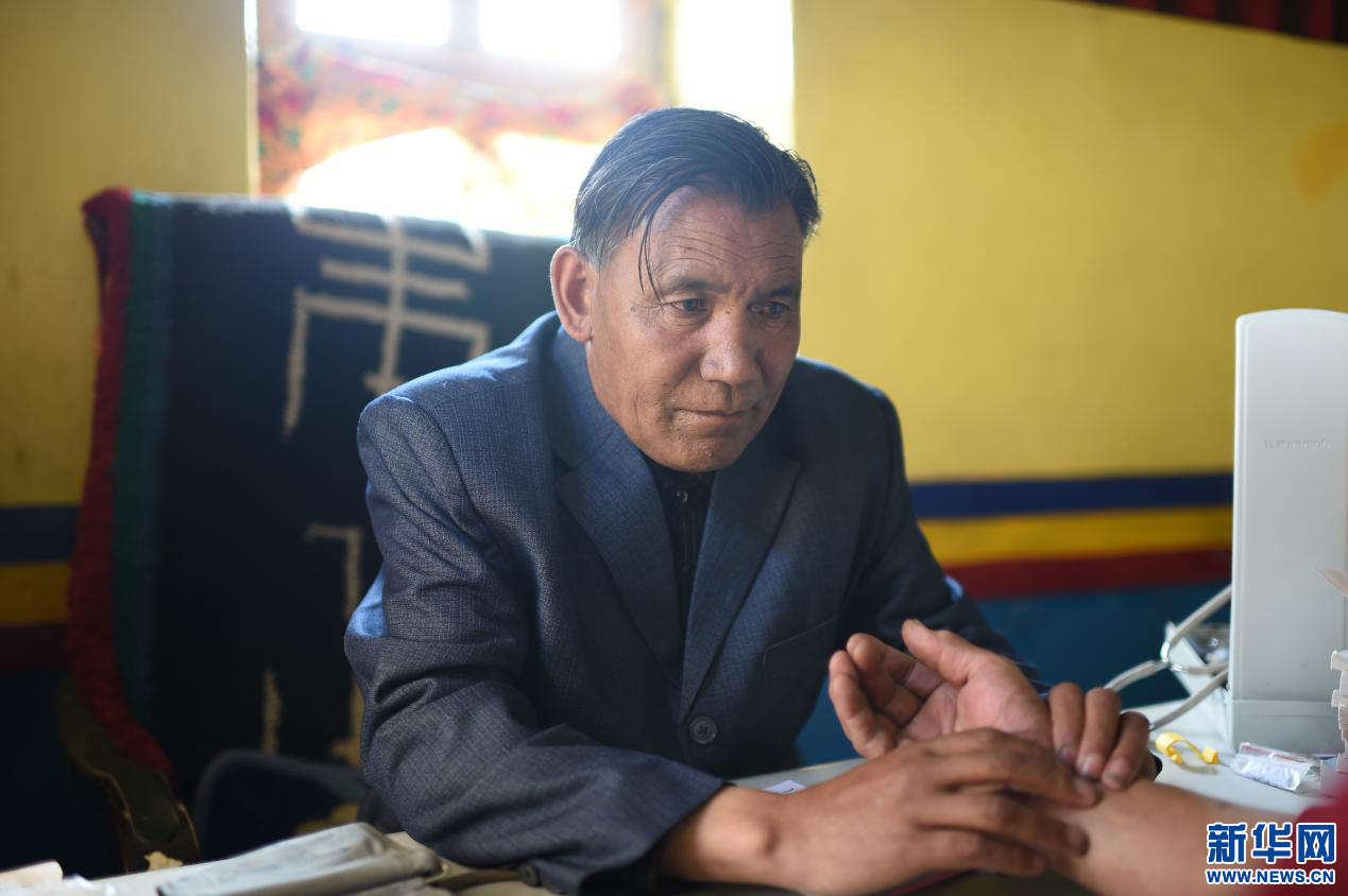 圖為西藏阿里岡底斯藏醫(yī)教學院校長才丹多吉在為患者把脈(4月20日攝)。新華網(wǎng) 旦增努布攝
