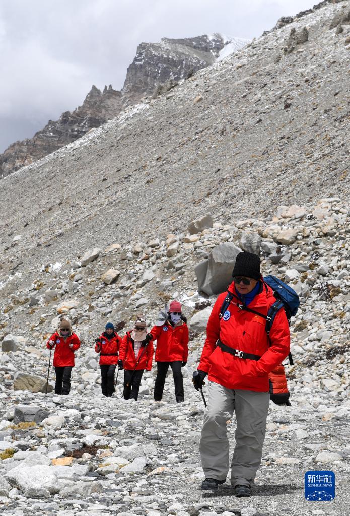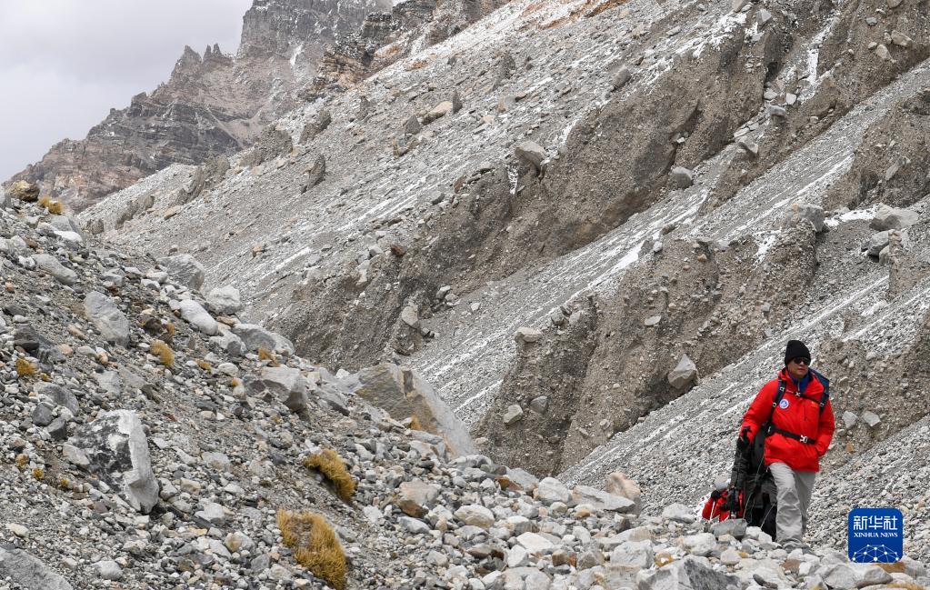 朱彤和科研人員在珠峰登山大本營(yíng)和絨布冰川間徒步穿梭(5月1日攝)。新華社記者 姜帆 攝