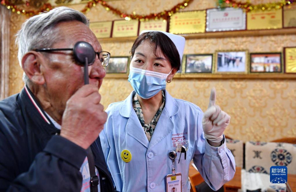 5月9日,醫(yī)務人員指導八廓社區(qū)居民進行視力測試。新華社記者 張汝鋒 攝