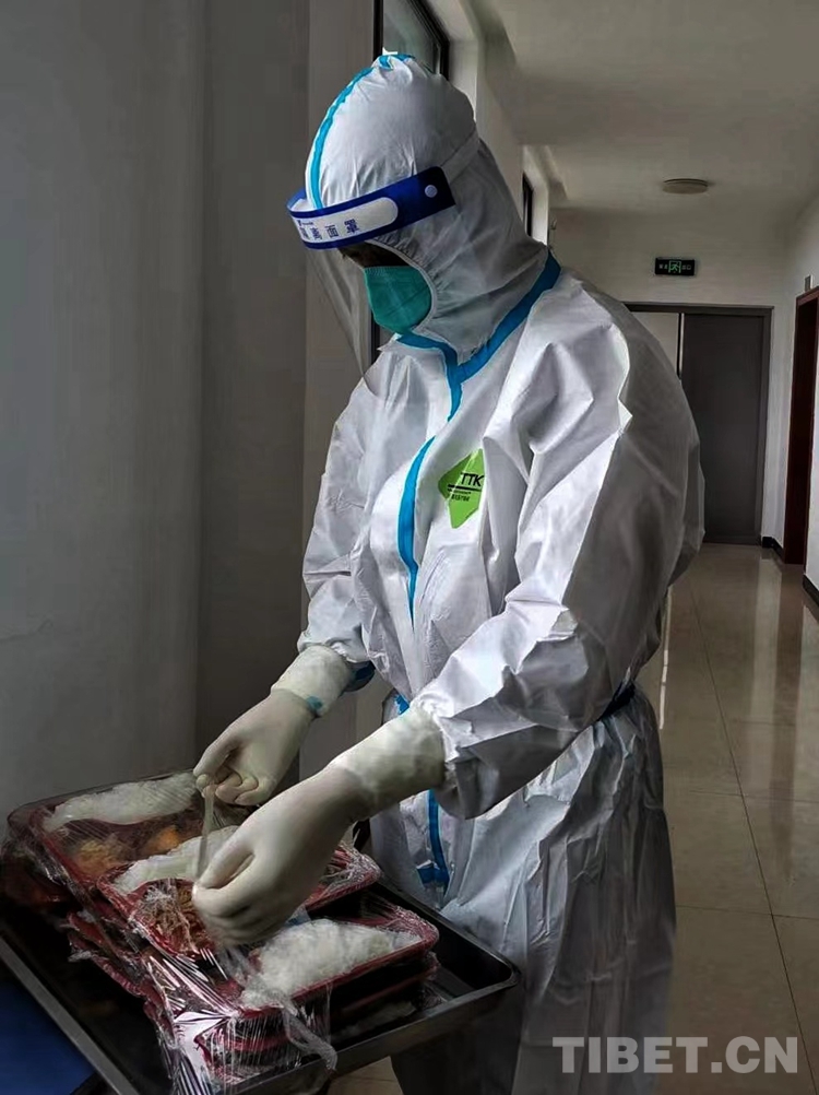 圖為瓊結(jié)縣藏醫(yī)院醫(yī)護(hù)人員在瓊結(jié)縣產(chǎn)業(yè)園隔離點給隔離人員送飯