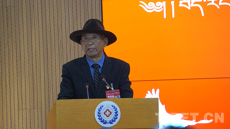 圖為慶祝西藏自治區(qū)人民醫(yī)院建院70周年大會上,醫(yī)院退休老同志仁青次旺發(fā)言 攝影:王媛媛