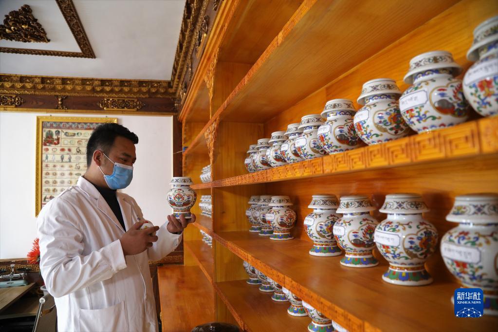 1月27日,在青海省海南藏族自治州貴德縣常牧鎮(zhèn)中心衛(wèi)生院藏醫(yī)館,醫(yī)生為患者取藏藥。新華社記者 央秀達(dá)珍 攝