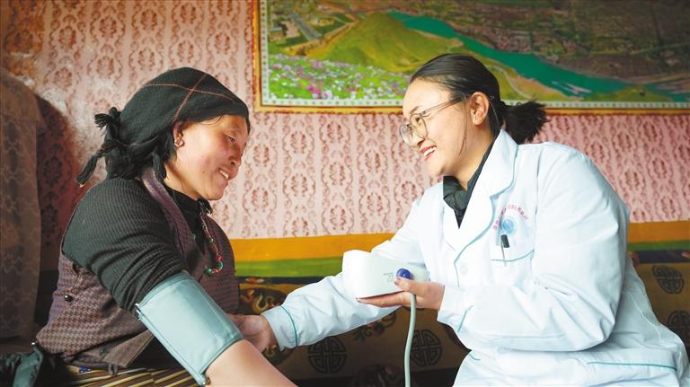 圖為墨竹工卡縣尼瑪江熱鄉(xiāng)邦達(dá)村簽約家庭醫(yī)生為村民測量血壓。記者 唐斌 通訊員 洛克 攝