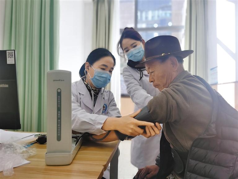 圖為乃東區(qū)結(jié)莎街道瑪嘎慶社區(qū)診所醫(yī)生為老人測量血壓。 記者 孫開遠(yuǎn) 攝