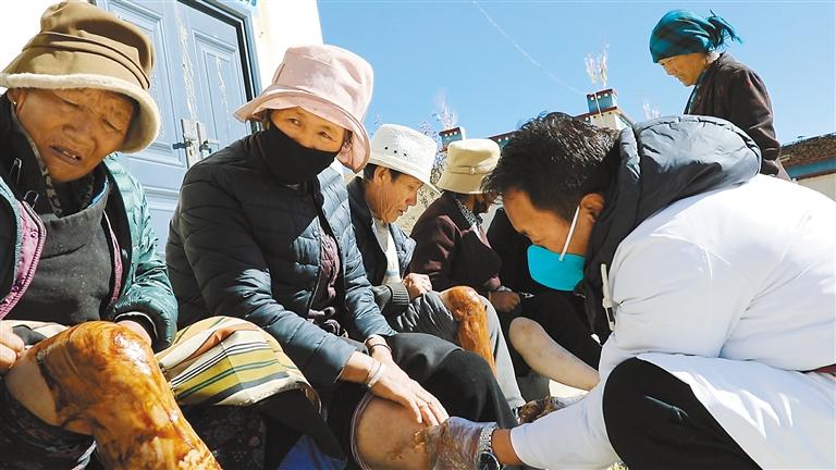 圖為措美縣家庭醫(yī)生服務(wù)團(tuán)隊(duì)的醫(yī)生上門為老年人體檢并涂抹緩解關(guān)節(jié)疼痛的藥膏。通訊員 王利軍 攝