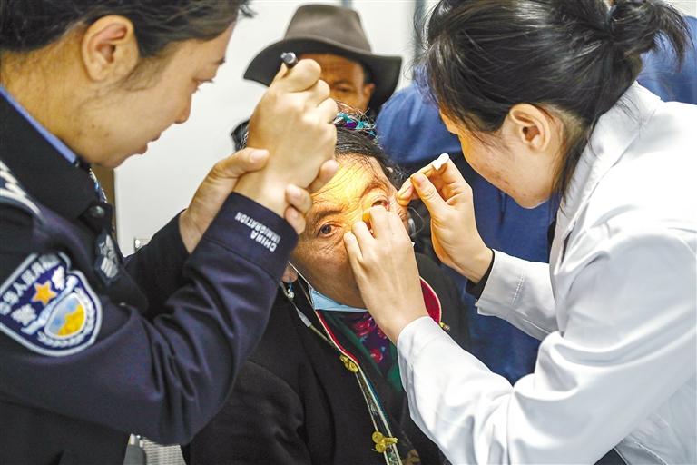 圖為醫(yī)療隊(duì)專(zhuān)家在為群眾檢查眼睛。記者 孫開(kāi)遠(yuǎn) 通訊員 劉戀 龍小鳳 攝