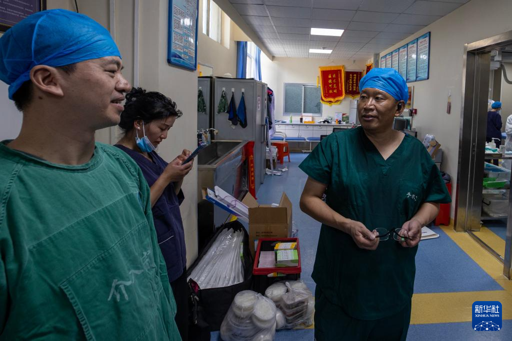 協(xié)和醫(yī)院第十批援藏醫(yī)生王強(qiáng)(左二)、第十一批援藏醫(yī)生蔣青偉(右二)和西藏自治區(qū)人民醫(yī)院醫(yī)生旦增索朗(左一)在手術(shù)室外監(jiān)控指揮手術(shù)(8月5日攝)。新華社記者 姜帆 攝 ??