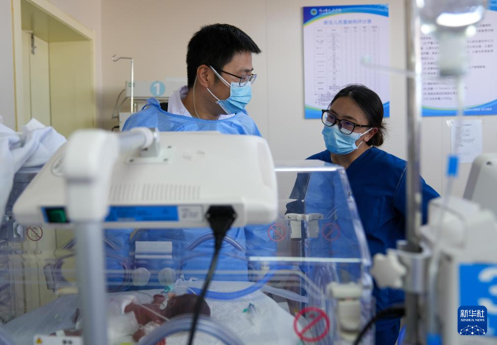 在那曲市人民醫(yī)院新生兒重癥監(jiān)護(hù)室,來自大連醫(yī)科大學(xué)附屬第一醫(yī)院的援藏醫(yī)生田聰亮(左)和護(hù)士旦珍合作為一名早產(chǎn)兒實(shí)施機(jī)械通氣治療(7月18日攝)。新華社記者 晉美多吉 攝 ??