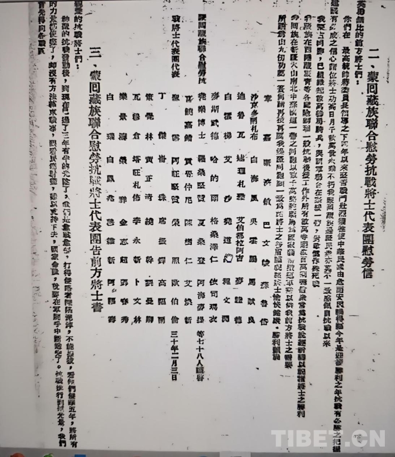 圖為《蒙回藏族聯(lián)合慰勞抗戰(zhàn)將士代表團告前方將士書》(喜饒尼瑪供圖)
