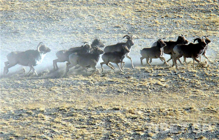 圖為奔跑在羌塘國家級自然保護區(qū)的國家二級保護動物盤羊(2006年) 攝影:唐召明