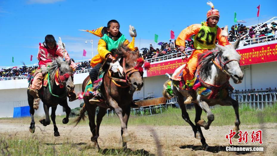 8月12日,2020年那曲羌塘恰青格薩爾賽馬藝術節(jié)在西藏那曲舉行,參賽選手均為9至14歲的少年騎手。圖為騎手參加8000米場內(nèi)速度賽馬比賽。中新社記者 張偉 攝