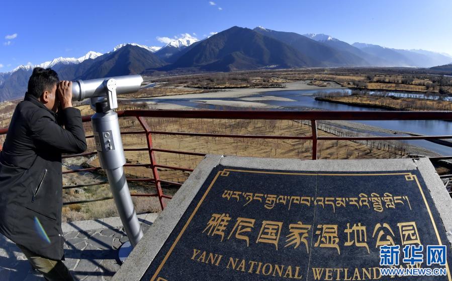 一名游客借助望遠(yuǎn)鏡觀看西藏雅尼國(guó)家濕地公園的景色(2月2日攝)。新華社記者 張汝鋒 攝