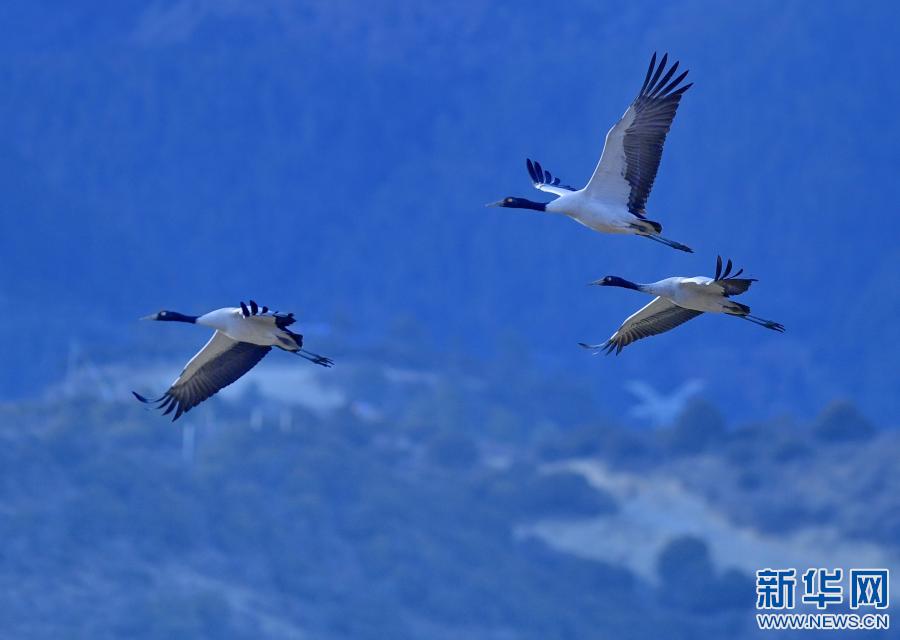 黑頸鶴在西藏雅尼國(guó)家濕地公園上空飛舞(2月1日攝)。新華社記者 張汝鋒 攝