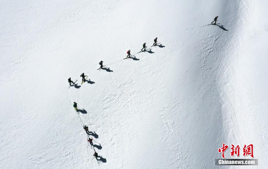 西藏拉薩河谷1號冰川(廓瓊崗日冰川)景區(qū)將與2021年4月正式全面開放,洛堆峰雪山攀登項目也將正式啟動。資料圖為登山愛好者攀登洛堆峰。(無人機拍攝)中新社發(fā) 貢嘎來松 攝
