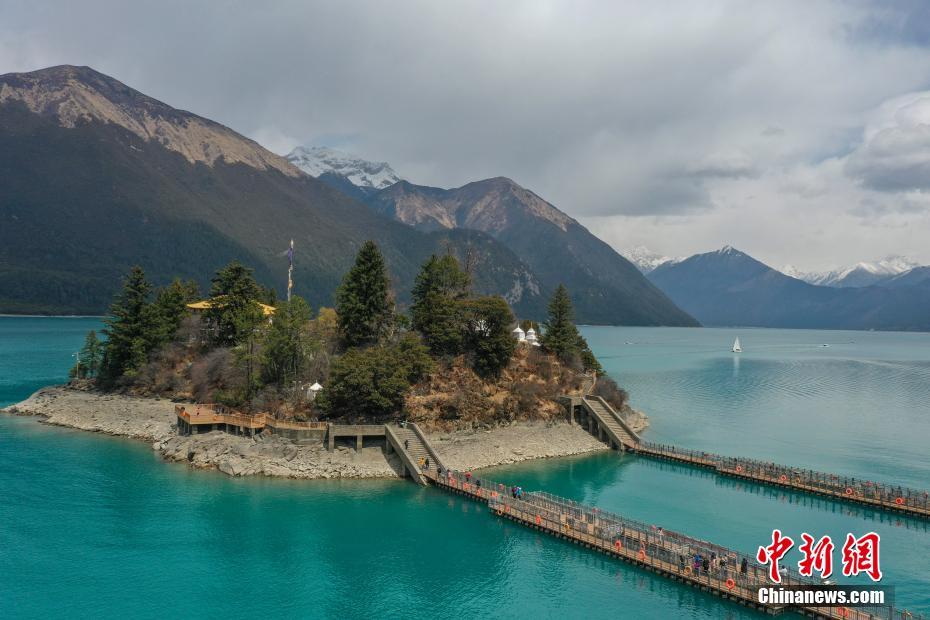 巴松措位于西藏林芝,湖面海拔3480米,是西藏海拔最低的大湖。湖水呈碧綠色,清澈透亮,四周環(huán)繞的雪山和樹木倒映其中,美不勝收。圖為3月29日,游客在扎西島游玩。(無人機(jī)拍攝)中新社發(fā) 貢嘎來松 攝