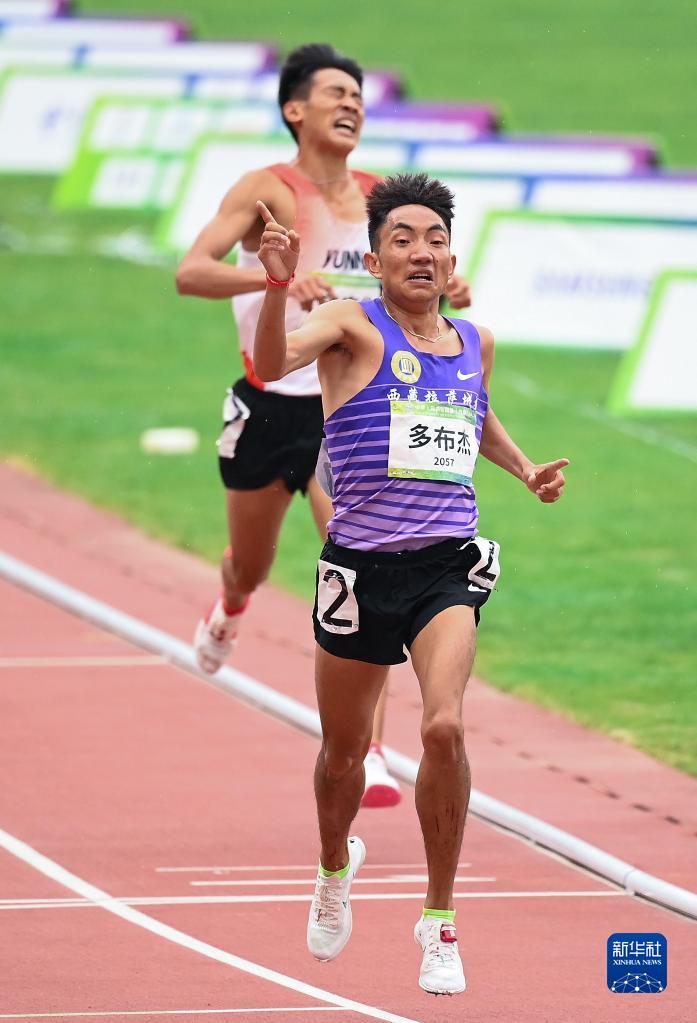 在第十四屆全運會田徑項目男子5000米決賽中,西藏隊選手多布杰(前)以13分49秒16的成績奪冠(2021年9月23日攝)。新華社記者 宋彥樺 攝