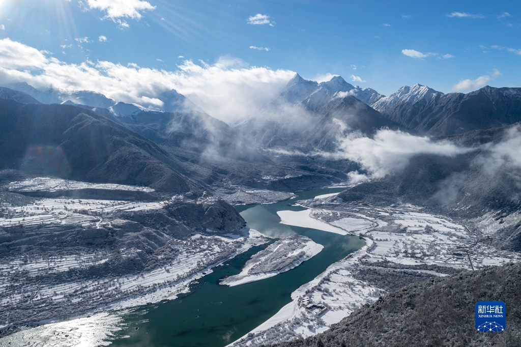 當日,西藏林芝市米林縣派鎮(zhèn)雅魯藏布大峽谷附近普降瑞雪,銀裝素裹的雅魯藏布江和南迦巴瓦峰顯得格外壯美。