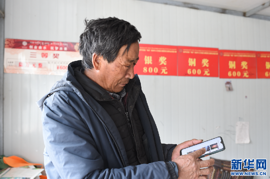 2月24日,曲水俊巴民族手工皮具制作傳承人次仁通過手機(jī)上網(wǎng)為客戶介紹皮具產(chǎn)品。新華網(wǎng) 旦增努布 攝