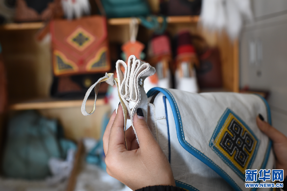曲水俊巴民族手工皮具制作專業(yè)合作社設(shè)計的伸縮包。(2月24日攝)新華網(wǎng) 旦增努布 攝