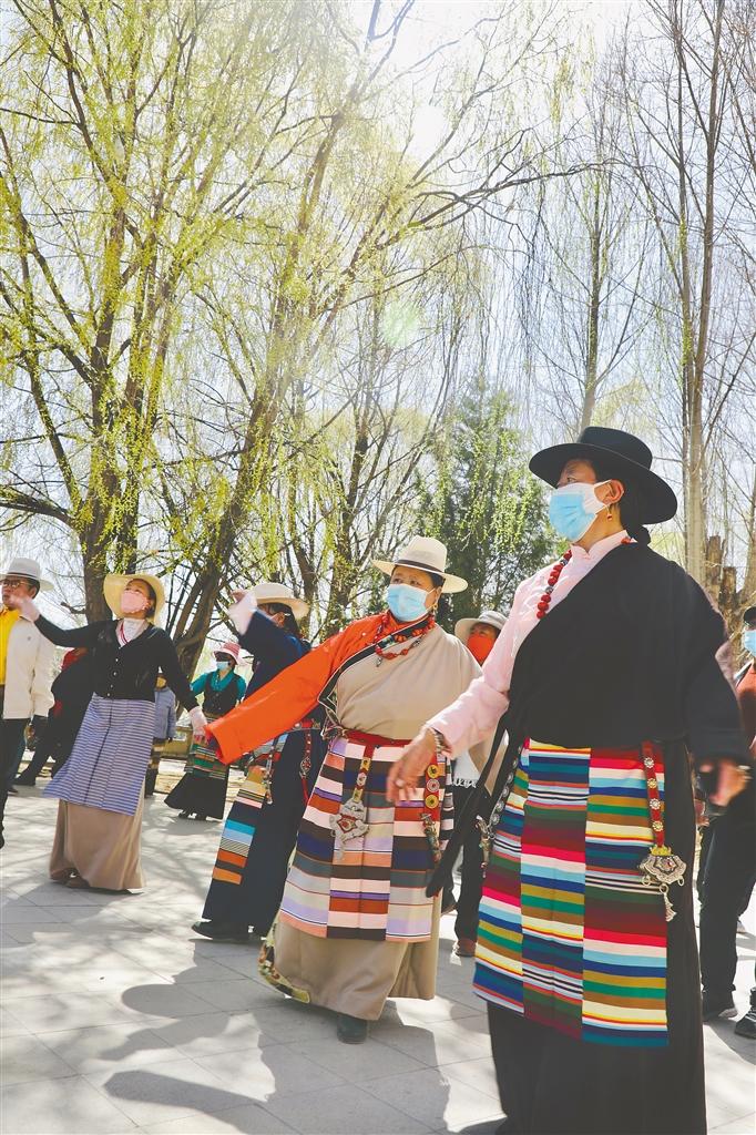 經(jīng)過春意潤染的城市,處處呈現(xiàn)出純凈明朗的美。布達(dá)拉宮的金頂反射著耀眼的金光,布達(dá)拉宮廣場前綠草茵茵,人工湖旁的垂柳被和煦的春風(fēng)吹得飄飄揚(yáng)揚(yáng),羅布林卡里的古樹也開始抽出鮮嫩的枝葉,繁華的八廓街上,三五成群的轉(zhuǎn)經(jīng)老人坐在路邊歇息……