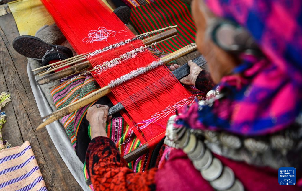 本央在編織制作僜人服飾所需要的布料(4月19日攝)。新華社記者 孫非 攝